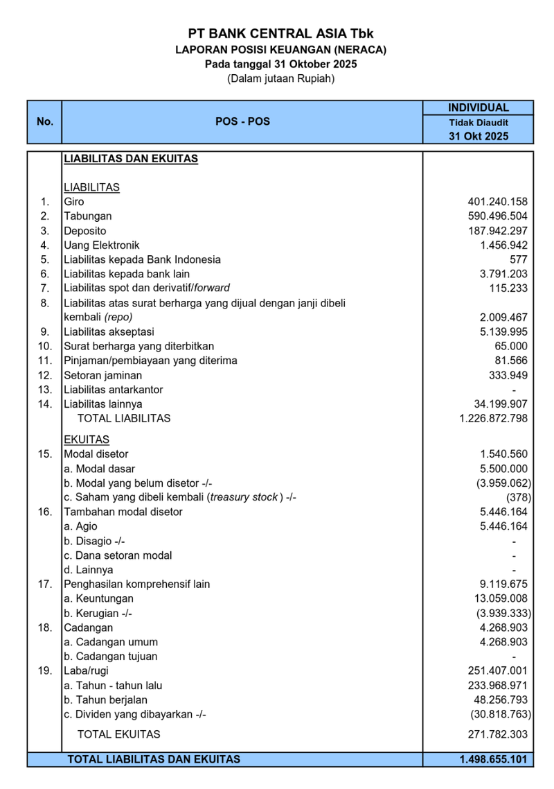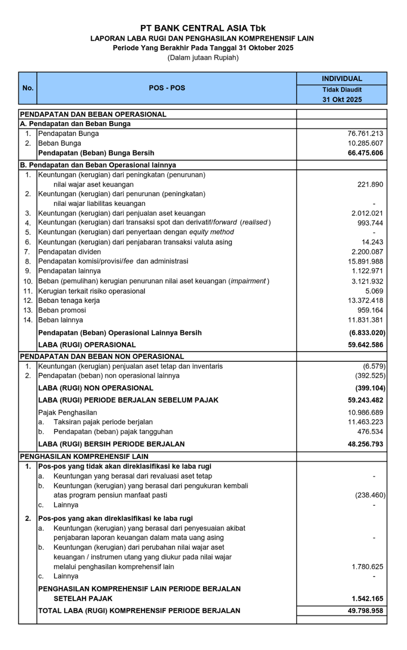 Disclaimer Penting: Data yang digunakan adalah Laporan Keuangan Individual (bukan konsolidasian) BCA periode 10 bulan (Januari-Oktober 2025) yang belum diaudit. Untuk analisis investasi yang komprehensif, investor sebaiknya menggunakan laporan konsolidasian yang mencerminkan kinerja seluruh grup perusahaan.
